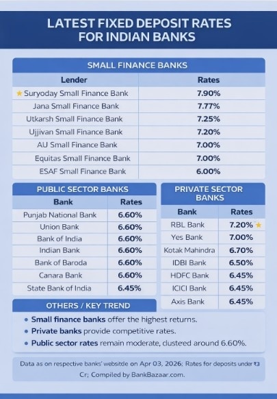 Fixed deposit (FD) rates across bank categories show a clear hierarchy, balancing return, safety, and risk. Public sector banks (PSBs) continue to offer relatively stable and clustered rates, with most large lenders such as Punjab National Bank, Bank of Baroda, Union Bank, and Canara Bank offering around 6.60%, while SBI remains slightly lower at 6.45%. This segment appeals to conservative investors prioritising capital safety and predictable returns.