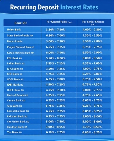 A Recurring Deposit (RD) is a term deposit that allows individuals to invest a fixed amount every month rather than depositing a lump sum, as in a Fixed Deposit.