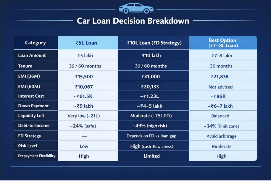 However, the ₹5 lakh loan approach has flaws too. Making a ₹9 lakh down payment from your ₹10 lakh corpus leaves you with just ₹1 lakh for emergencies, which is dangerously low. A middle way is to borrow ₹7-8 lakh for a 36-month tenure. For a ₹7 lakh loan, your EMI will be ₹21,838.