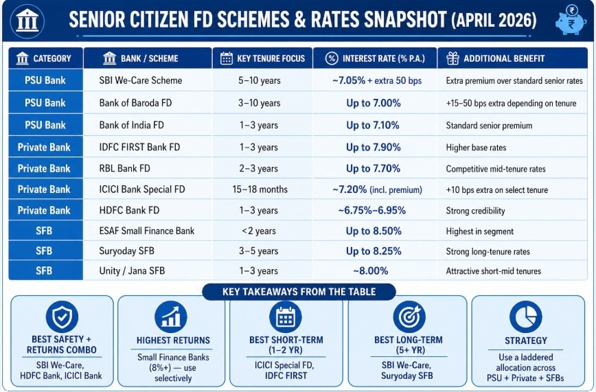 With interest rates near cyclical highs, locking into FDs now can help senior citizens secure stable income streams for the coming years.As interest rate cycles show signs of plateauing, senior citizens looking for stable, high-yielding fixed deposits (FDs) may find the current window particularly attractive. With banks offering elevated rates and special schemes, the period leading up to the end of April 2026 could be a strategic entry point for retirees seeking predictable income and capital safety.