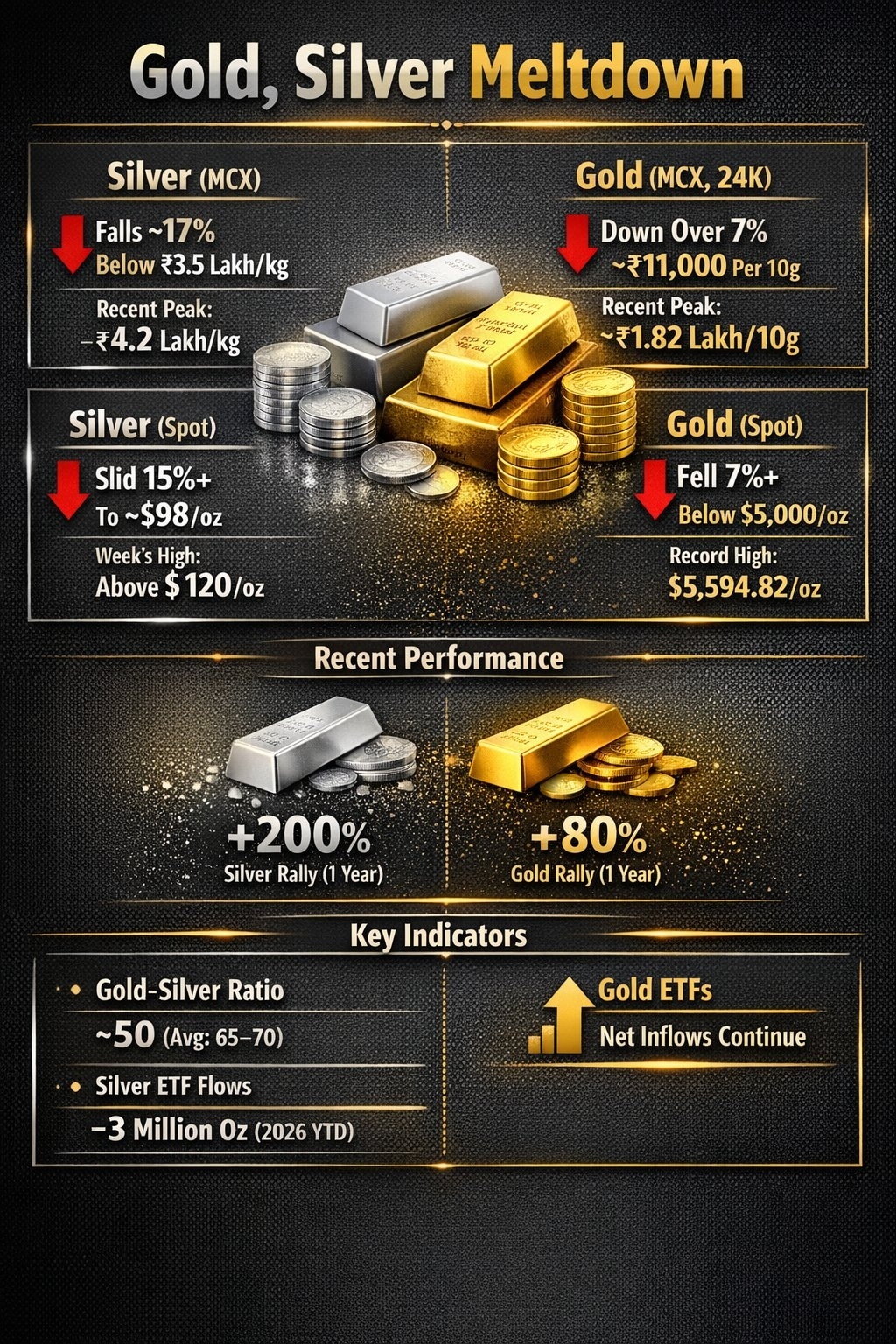According to a recent report by Motilal Oswal Financial Services (MOFSL), silver’s exceptional outperformance over the past year may itself have become a warning signal.Gold and silver prices suffered one of their sharpest corrections in years on Friday, snapping a powerful rally that had pushed both metals to record highs and forcing investors to reassess near-term risk. Silver plunged nearly 17% to below ₹3.5 lakh per kg on the MCX, while gold fell more than 7%, wiping out around ₹11,000 per 10 grams. While the speed of the decline startled markets, analysts say the correction had been increasingly signalled by stretched valuations and rising volatility—particularly in silver.
