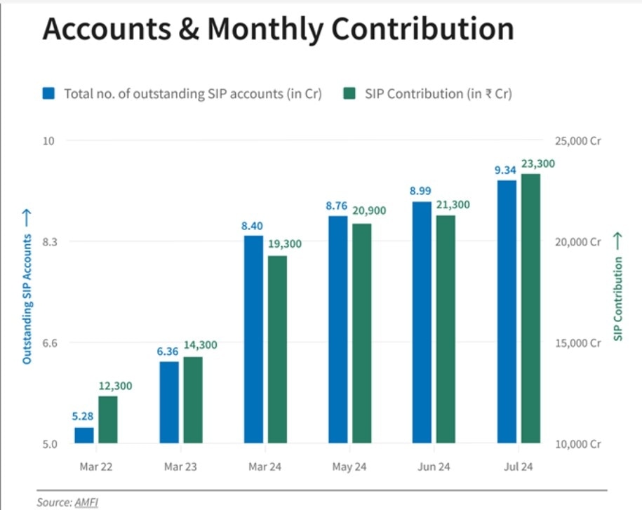 The study stated that the number of SIP accounts saw a significant 59% increase, growing from 5.28 crore to 8.4 crore between March 2022 and March 2024. This trend continued with the rise in SIP accounts in FY25 accounting to a total number of outstanding SIP accounts of more than 9 crore as of July 2024