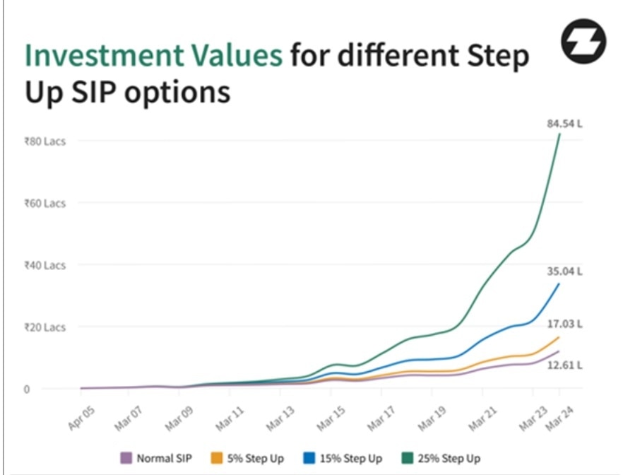 With a 5% annual step-up it can grow to about Rs 17 lakhs by March 31, 2024. The value increases to Rs 35 lakhs with an annual step-up of 15%, and to an impressive number close to Rs 84 lakhs with an annual step-up of 25%.