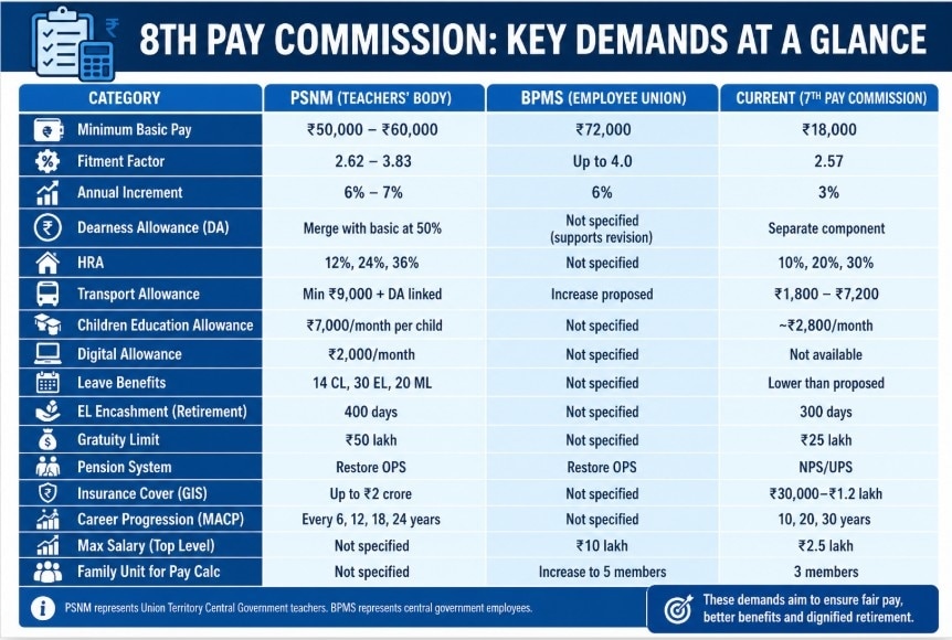 The Pragatisheel Shikshak Nyaya Manch (PSNM), representing Union Territory central government teachers, has called for a comprehensive restructuring of compensation. In its memorandum, the body has demanded a minimum basic pay of ₹50,000–₹60,000 for Level 1 employees, a sharp increase from the current ₹18,000 under the 7th Pay Commission.