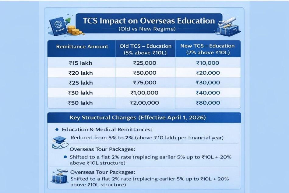 From April 1, 2026, TCS on education remittances above ₹10 lakh drops to 2%, and tour packages move to a flat 2% rate.