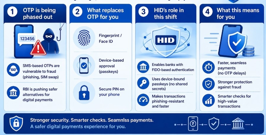 HID’s FIDO-based solutions help banks replace OTP risks by securing transactions through device-bound public key cryptography.If you use UPI, net banking, or mobile wallets, the way your payments are authenticated is changing. The Reserve Bank of India (RBI) has introduced new rules effective April 1, 2026, requiring stronger verification for digital transactions. Instead of relying mainly on SMS-based OTPs, you will now see more secure multi-factor authentication (MFA) methods being adopted.
