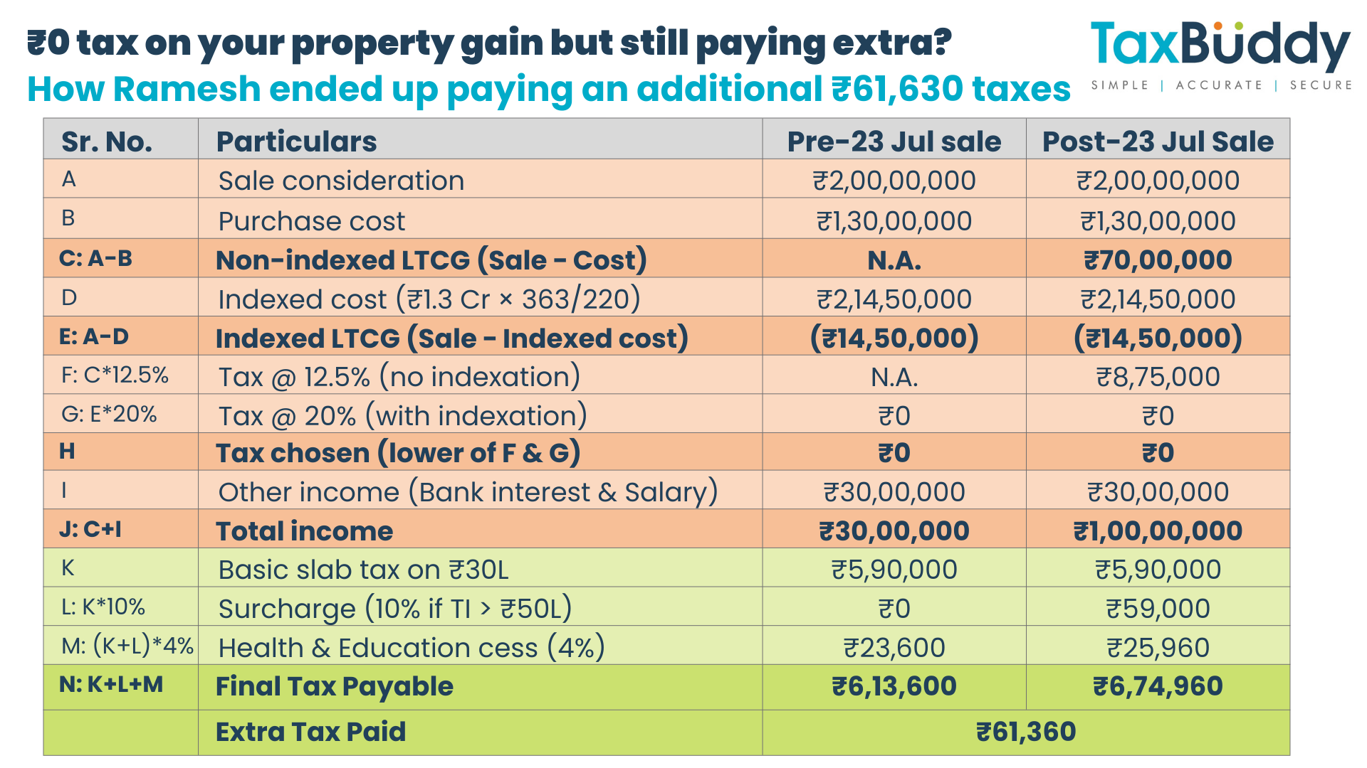 After July 2024 (sale in Jan 2025): Total income = Rs 1 crore → Surcharge kicks in → Tax = Rs 6.74 lakh