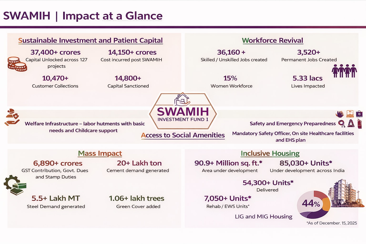 It has supported the creation of over 36,160 skilled and unskilled jobs, including 3,520 permanent roles, with women accounting for 15% of the workforce. More than 5.33 lakh lives have been impacted. On the infrastructure side, SWAMIH-backed projects have generated demand for over 20 lakh tonnes of cement and 5.5 lakh tonnes of steel, added more than 1.06 lakh trees, and delivered over 54,300 homes, with a strong focus on affordable housing.