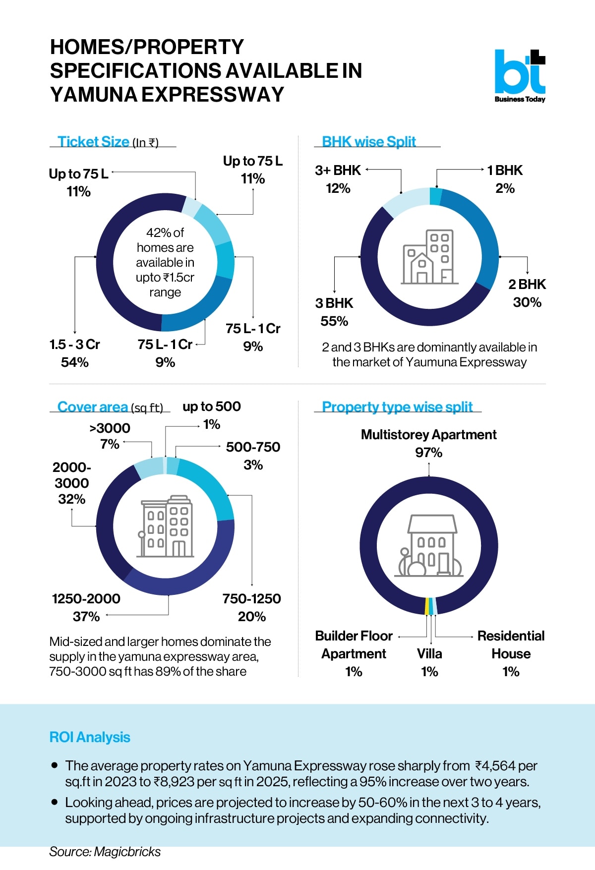 The rise in property prices can be primarily attributed to the ongoing infrastructure development and improvements in connectivity. Yamuna Expressway - Delhi-NCR's hottest realty hub-has witnessed an average property price appreciation of 95% in just two years. Rates along the expressway near the Jewar airport have risen from Rs 4,564 per square foot in 2023 to Rs 8,923 per square foot in 2025, according to MagicBricks data. The rise in property prices can be primarily attributed to the ongoing infrastructure development and improvements in connectivity. Market projections indicate that prices could climb by a further 50-60% over the next three to four years, as large-scale projects continue to reshape the region, says the real estate research firm.