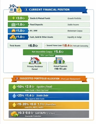 Thinking about early retirement is a good start, but the real question is sustainability over the next 40–45 years of life. After repaying the ₹40 lakh loan on your second home, you are left with around ₹5.6 crore to invest, and both homes are fully owned. With annual expenses of ₹10–15 lakh, you are drawing only about 2% of your total wealth each year. This is well below the commonly accepted safe limit of 3%. In simple terms, you are already in a very comfortable financial position. This plan does not rely on the stock market delivering extraordinary returns; it only needs markets to behave reasonably over time, something history suggests is a fair expectation.