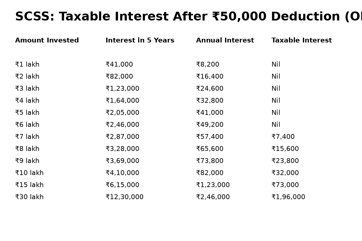 Interest earned from SCSS is fully taxable at the applicable slab rate in the hands of the investor. Under the old regime, senior citizens can claim a deduction of up to Rs 50,000 per year under Section 80TTB on interest income from bank deposits and post office schemes, including SCSS. Any interest above this limit becomes taxable.