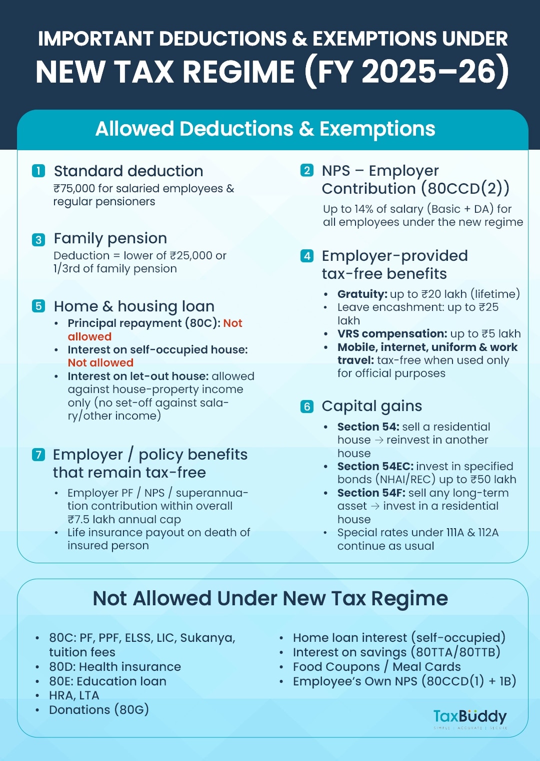 Tax Buddy outlined the key deductions and exemptions available under New Tax Regime for FY 2025–26, while also clearly flagging what is not permitted.