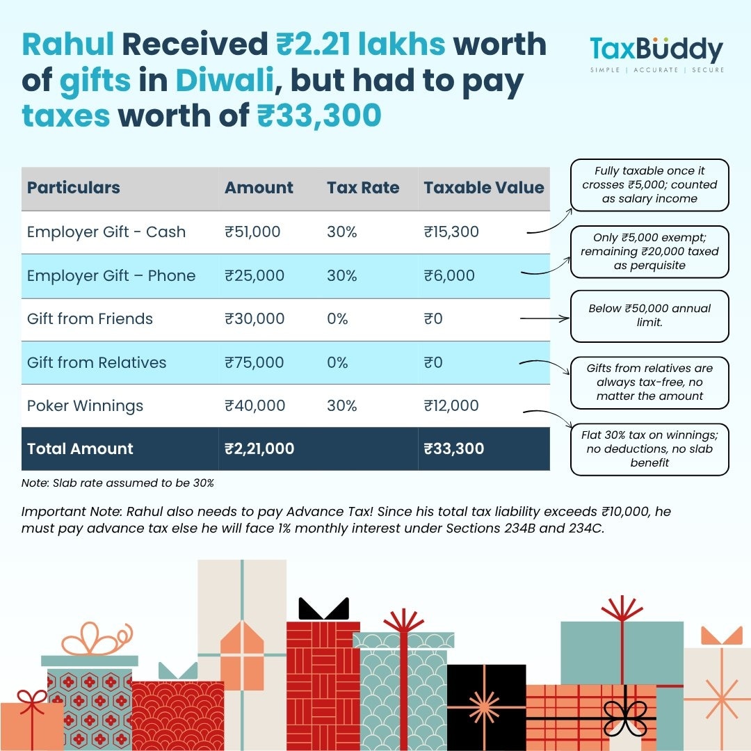 Tax advisory platform TaxBuddy.com recently shared a real-life example that went viral online. Their client, Rahul, received Diwali gifts worth Rs 2.21 lakh this year from his employer, family, and friends. What he thought was a cheerful celebration turned into a surprise when his chartered accountant told him he owed Rs 33,300 in taxes — and possibly interest for delayed advance tax payment.