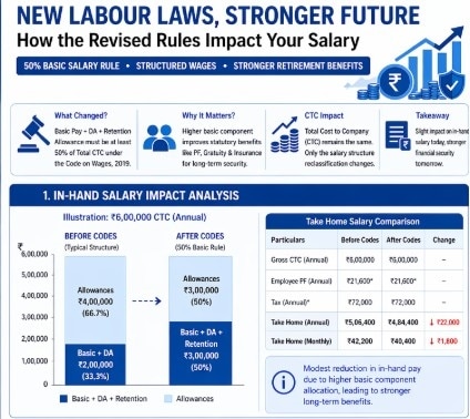 According to experts, under the new labour law framework, the basic salary, dearness allowances & retaining allowances is required to be at least 50% of total CTC. The new labour laws that came into effect from April 1 are set to significantly reshape salary structures for millions of salaried employees, with a clear shift in emphasis from immediate take-home pay to long-term financial security. At the core of this reform is a standardised definition of “wages,” which mandates that basic pay, dearness allowance (DA), and retention allowance together must constitute at least 50% of an employee’s total compensation.