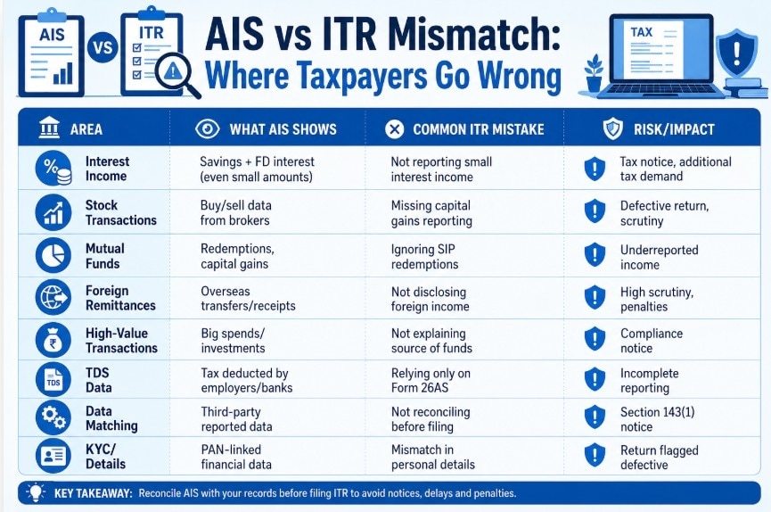 Tax professionals recommend that taxpayers should carefully review AIS before filing returns, identify mismatches, and either correct their ITR or document valid reasons for differences.As the Income Tax Department sharpens its data analytics capabilities, a new compliance risk is emerging for taxpayers —a mismatch between the Annual Information Statement (AIS) and Income Tax Returns (ITR). Experts warn that what was once a routine filing exercise has now evolved into a data-matching process, where even minor discrepancies can trigger automated notices.