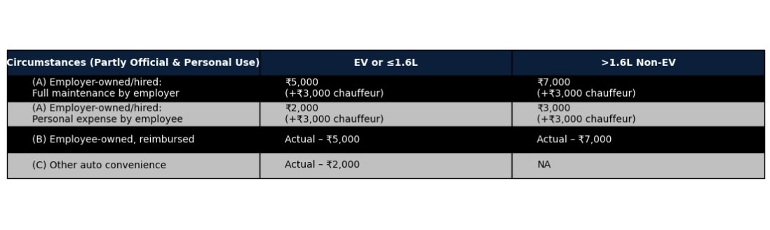 For instance, where a car is used for both official and personal purposes, the perquisite value for EVs is capped at ₹5,000 per month (plus ₹3,000 if a chauffeur is provided) when maintenance is borne by the employer. This is lower compared to higher-capacity vehicles, which attract a higher taxable value.