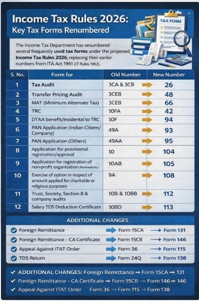 Under the revised list of commonly used forms, nearly 30 forms have been renumbered, requiring taxpayers, chartered accountants, companies and trusts to use the updated formats going forward.The Income Tax Department has introduced a major overhaul in form numbering under the Income Tax Rules 2026, replacing several commonly used forms that were earlier prescribed under the Income Tax Act 1961 and IT Rules 1962. The changes affect tax audit reports, PAN applications, TDS returns, charitable trust filings, foreign remittances, and appellate forms, among others.
