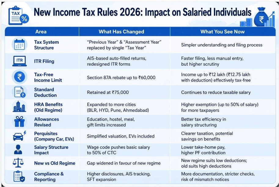 From this year, ITR forms are will get more streamlined and increasingly auto-filled using AIS (Annual Information Statement) data.ITR rules 2026: With the new Income-tax Act, 2025 and Income-tax Rules, 2026 now in effect, salaried individuals across India are beginning to see tangible changes in how their income is taxed, reported, and structured. While the overhaul does not drastically alter tax rates, it significantly reshapes compliance, exemptions, and salary components.