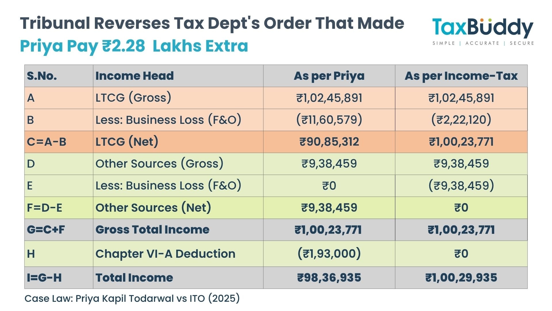Priya set off her F&O loss against LTCG, preserving her interest income from the “Income from Other Sources” head. This move allowed her gross total income (GTI) to include non-capital gains income — a prerequisite for claiming deductions under Chapter VI-A (like 80C, 80D etc.).