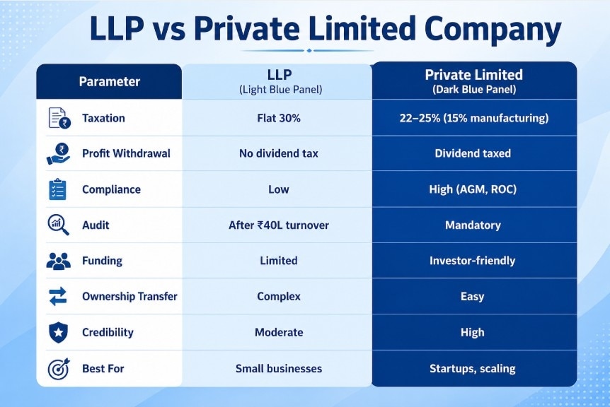 LLPs allow tax-free profit withdrawals, while Private Limited dividends are taxed in shareholders’ hands.Choosing the right business structure is one of the most critical decisions for entrepreneurs, as it shapes taxation, compliance burden, funding access, and long-term scalability. In India, the two most common structures are Limited Liability Partnerships (LLPs) and Private Limited Companies, each offering distinct advantages depending on business goals.