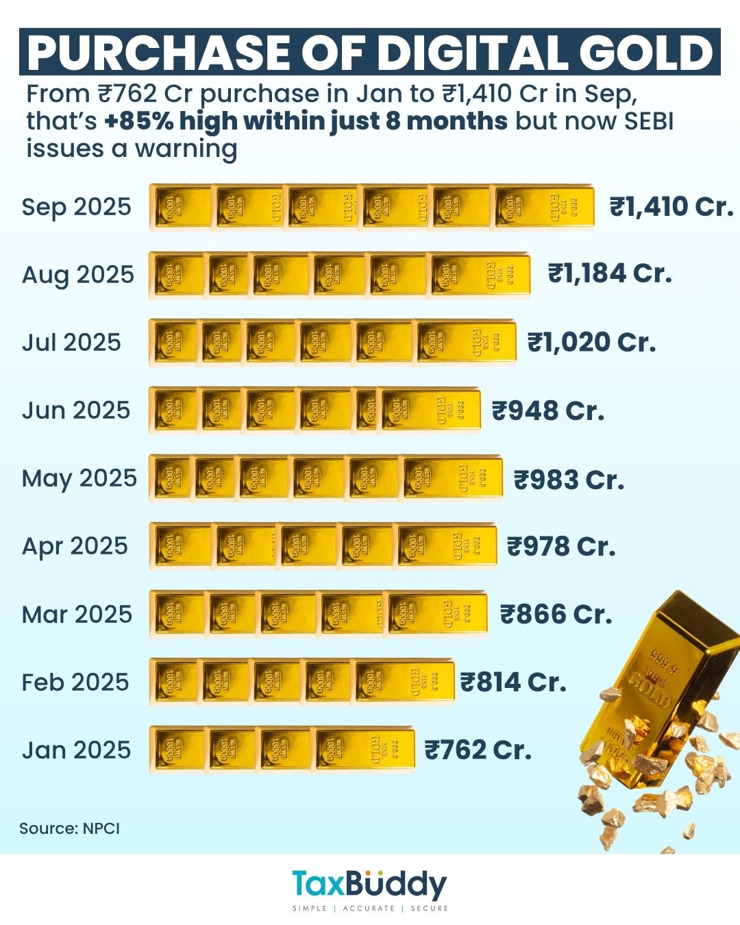 Indians bought over Rs 9,000 crore of digital gold in nine months, with monthly purchases rising from Rs 762 crore in January to Rs 1,410 crore in September 2025.As digital gold continues to gain traction across India’s investment landscape, regulators and tax experts are urging investors to fully understand the taxation framework and the risks associated with an increasingly popular yet largely unregulated product. The Securities and Exchange Board of India (SEBI) recently issued a fresh advisory warning consumers that digital gold does not fall under its jurisdiction, nor is it governed by the Reserve Bank of India (RBI) or any recognised commodity exchange. This leaves a vacuum of investor protection at a time when digital-gold transactions are hitting record highs.