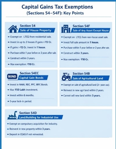 The Income Tax Act provides several exemptions under Sections 54 to 54F that can help taxpayers reduce or eliminate capital gains tax if certain conditions are met. Section 54 allows exemption on long-term capital gains from the sale of a residential property if the gains are reinvested in another house property. Taxpayers can invest in up to two houses if capital gains do not exceed ₹2 crore, a benefit allowed once in a lifetime.