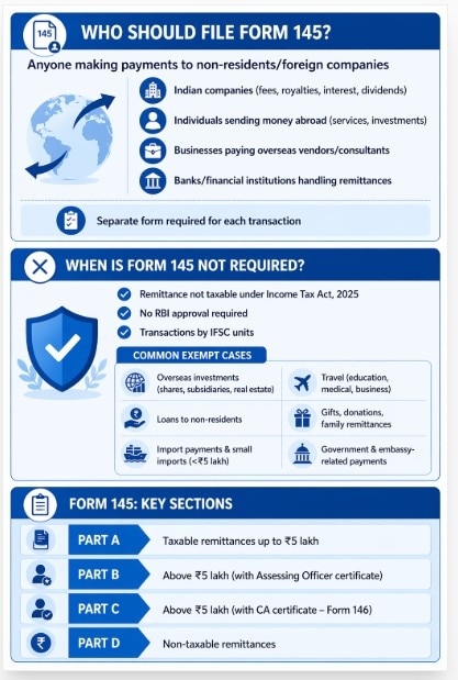 In cases where remittances are taxable and exceed ₹5 lakh, taxpayers may need to file Form 145 along with Form 146. However, if prior approval from the tax officer exists, the CA certificate requirement may be waived.