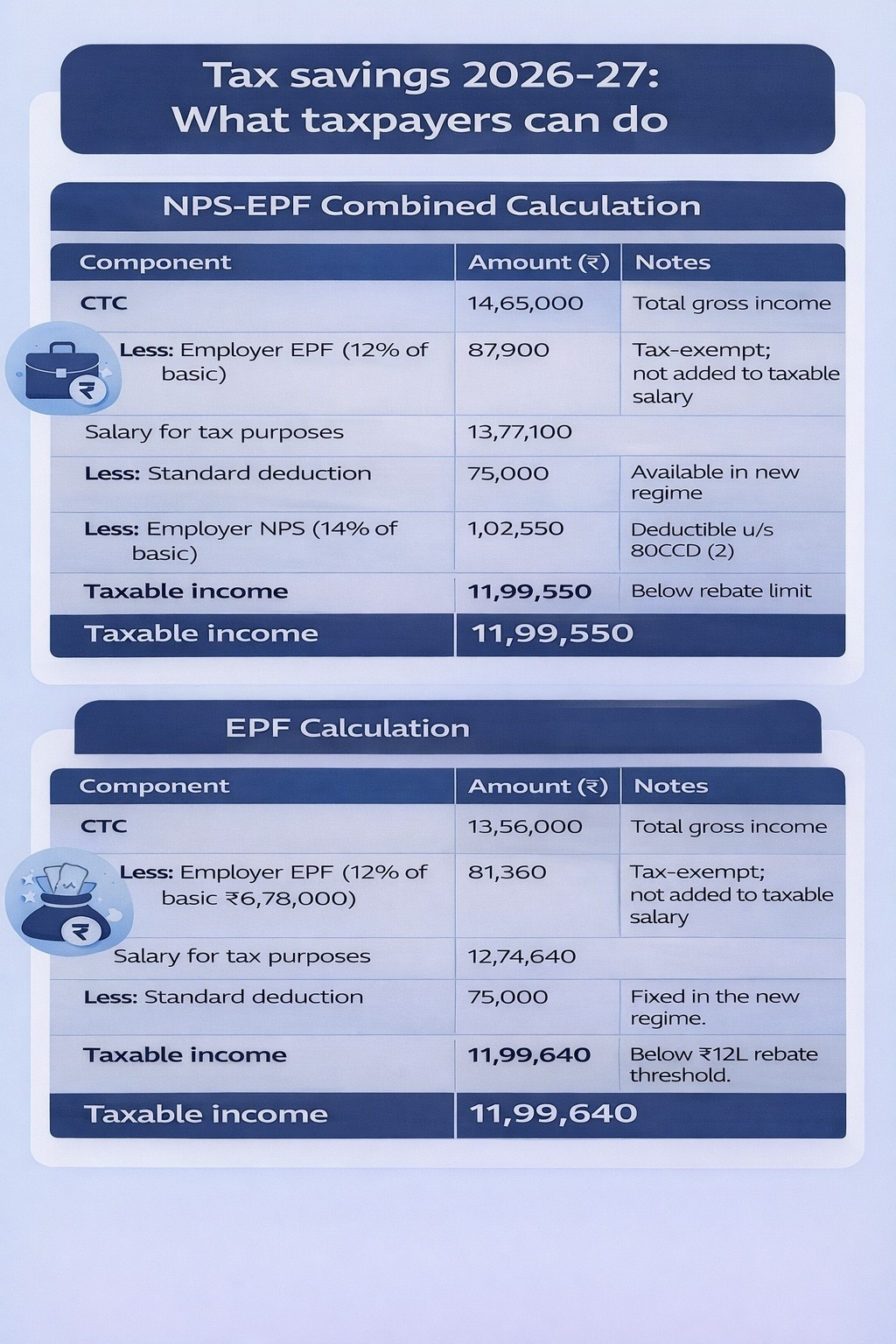 Under the new tax regime applicable for FY 2026–27, salaried taxpayers are eligible for a standard deduction of Rs 75,000. In addition, employer contributions to EPF and NPS, within prescribed limits, are either excluded from taxable salary or allowed as deductions. If these components are structured efficiently, taxable income can be brought down to Rs 12 lakh or below, making the taxpayer eligible for a rebate of up to Rs 60,000 under Section 87A, which effectively wipes out the entire tax liability.