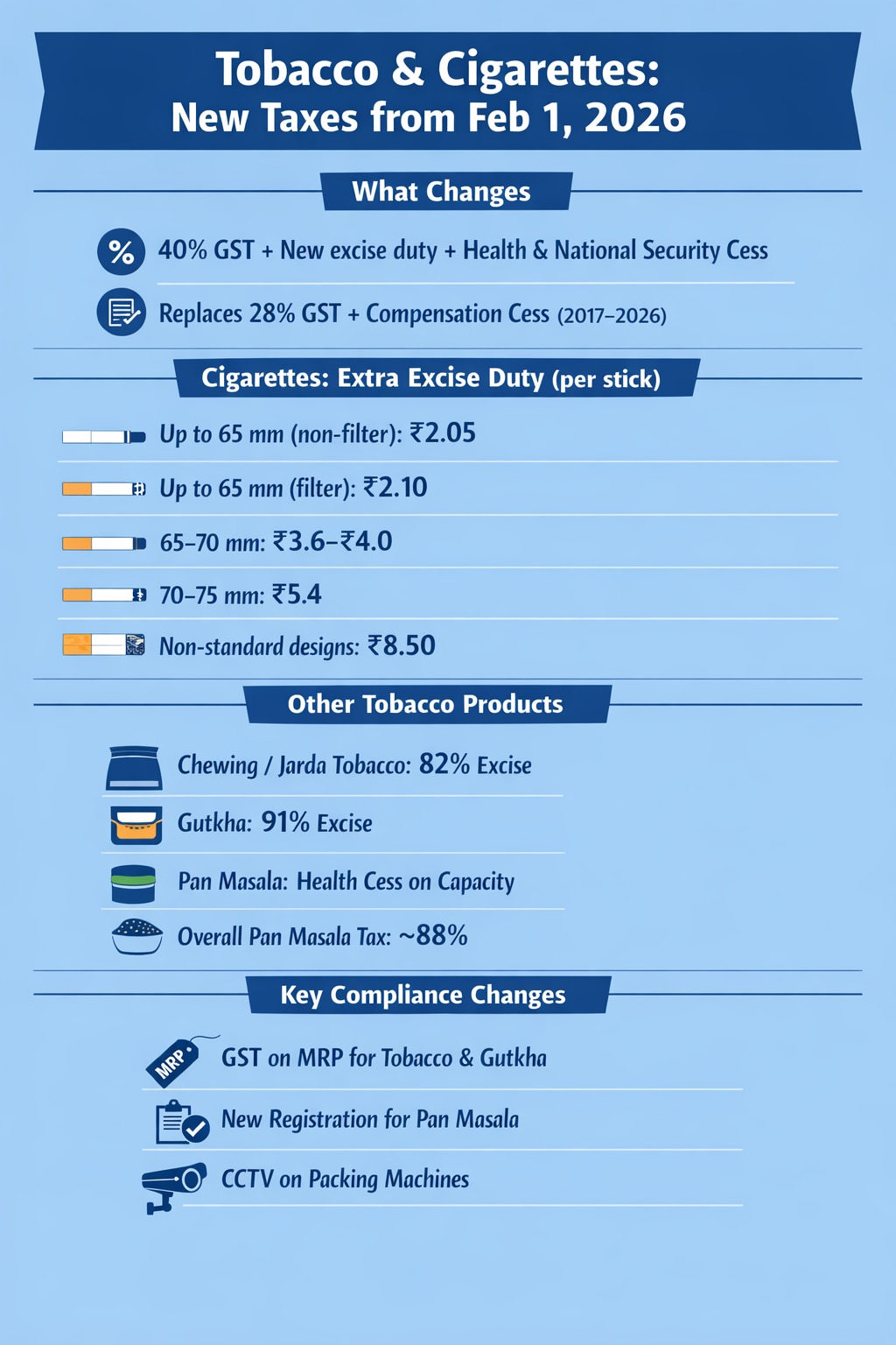 A key change effective February 1 is the introduction of an MRP-based valuation system for tobacco products such as chewing tobacco, filter khaini, jarda-scented tobacco and gutkha. Under this mechanism, GST will be calculated based on the retail sale price declared on the package, rather than transaction value, tightening compliance and limiting under-reporting.