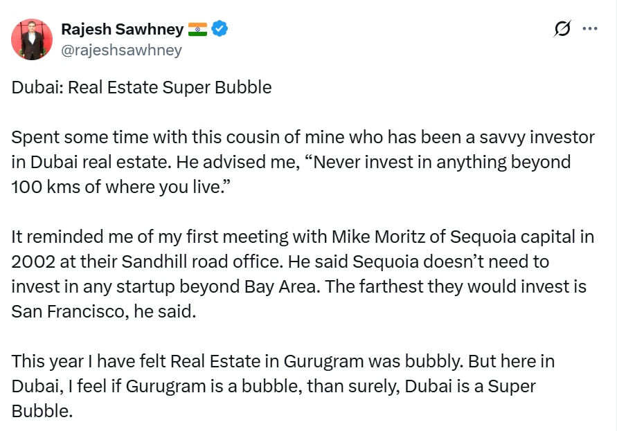 In a post titled 'Dubai: Real Estate Super Bubble', Sawhney said he spent some time with his cousin had been a savvy investor in Dubai real estate. "He advised me, 'Never invest in anything beyond 100 kms of where you live.' It reminded me of my first meeting with Mike Moritz of Sequoia Capital in 2002 at their Sandhill Road office. He said Sequoia doesn't need to invest in any startup beyond Bay Area. The farthest they would invest is San Francisco."
