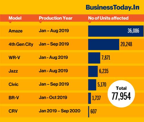 The recall covers 36,086 units of its compact sedan Amaze produced between January and August 2019 and 20,248 units of its mid size sedan City produced between January and September 2019. Around 8,000 units of its compact crossover WR-V and over 6,000 units of premium hatchback Jazz are also part of the recall exercise.