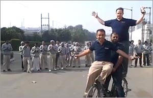Employees splash the energy drink on the bicycle-riding founders Kakkar (in front), Misra (centre) and Nutall <em>Photo: Shekhar Ghosh/www.indiatodayimages.com</em>