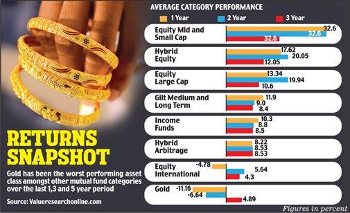 On the debt side, long term gilt and income funds returned 11 per cent, over the last one year period compared to - 11 per cent returned by gold. The underperformance resonates for the last 3 year and 5 year period also, where gold returned -6.5 per cent and 5 per cent.