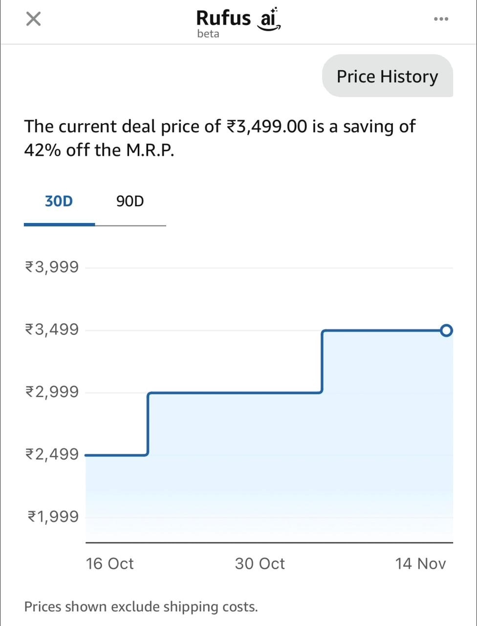 Within the app, users can navigate to a product page to find the “Price History” option right underneath the price, which opens the price history graph within Amazon's Rufus AI's tab. The graph displays the product’s price changes over selectable periods of 30 or 90 days, providing a clear historical record and allowing buyers to see price highs and lows leading up to, for example, the Great Indian Festival or Diwali sales and even beyond.