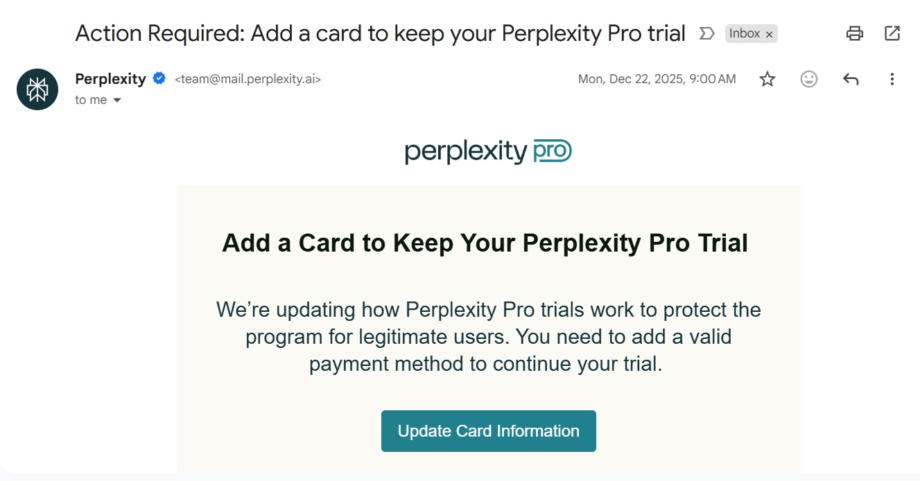 "We’re updating how Perplexity Pro trials work to protect the program for legitimate users. You need to add a valid payment method to continue your trial. Your card will only be charged after your trial offer ends, and your subscription will renew automatically unless cancelled beforehand," Perplexity had said in an email to users.