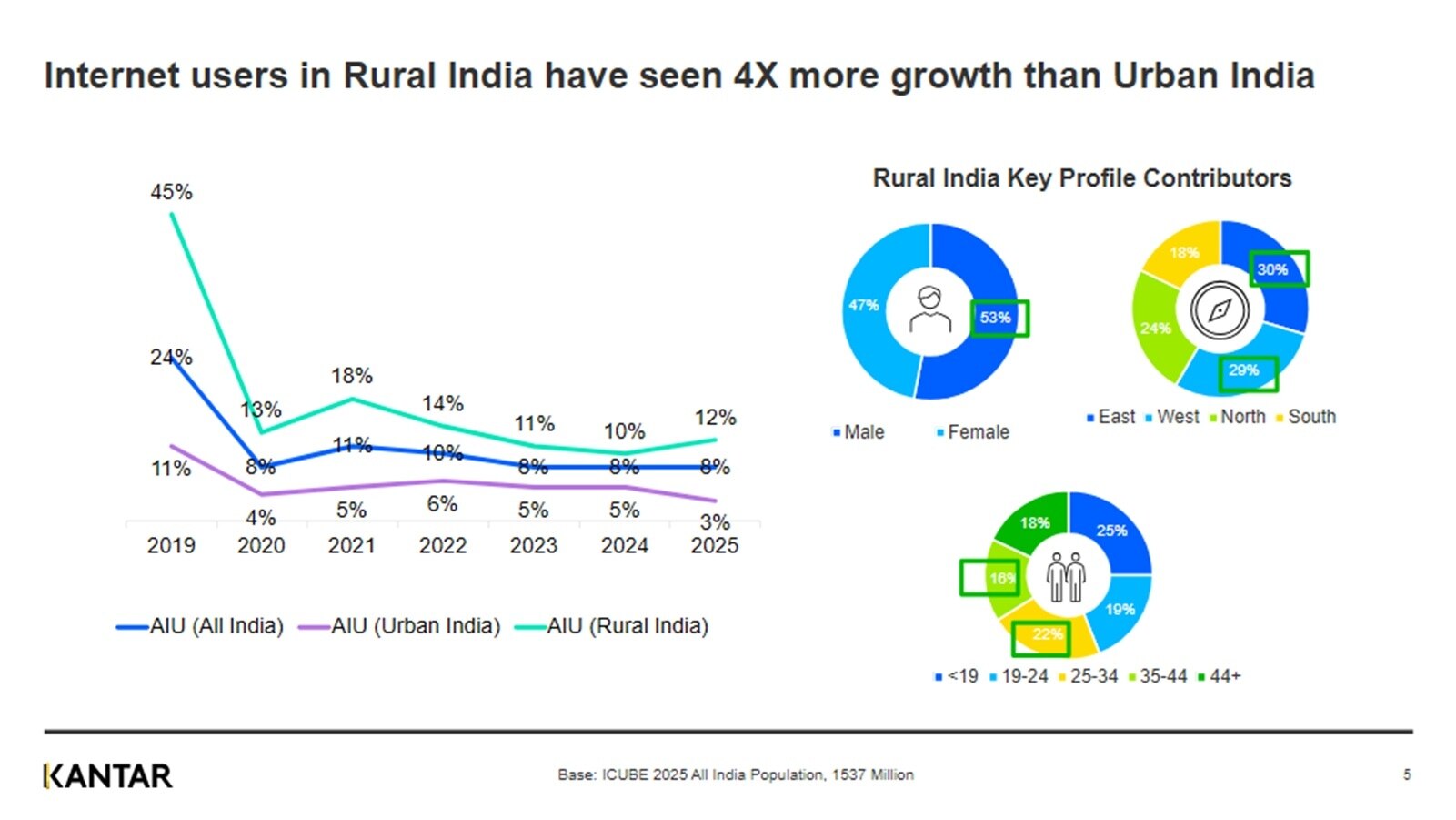 Rural India now accounts for about 548 million active internet users, or more than half the total base, and is growing at nearly four times the pace of urban India. Still, around 579 million people, or 38% of the population, remain non-active internet users, underscoring both the scale of India’s digital divide and the headroom for future growth.