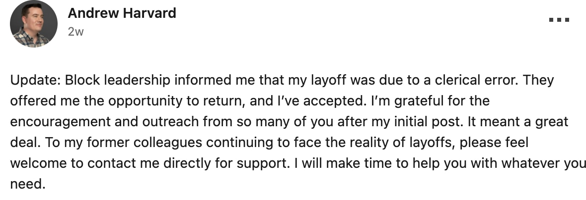According to LinkedIn posts by four employees, the company may have been considering rehiring some of the employees. Andrew Harvard, design engineer at Block, provided an update saying, “Block leadership informed me that my layoff was due to a clerical error. They offered me the opportunity to return, and I’ve accepted.”