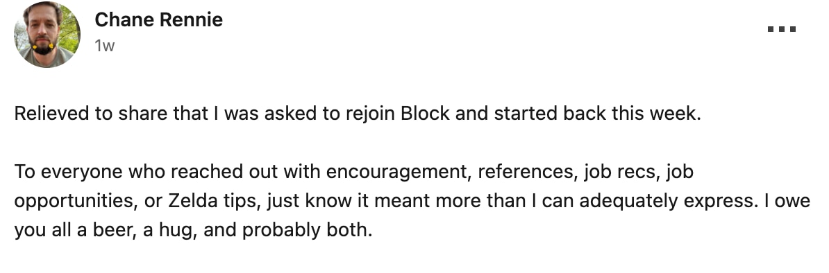 Chane Rennie, Block’s Creative Strategy Lead, said on LinkedIn, “Relieved to share that I was asked to rejoin Block and started back this week.”