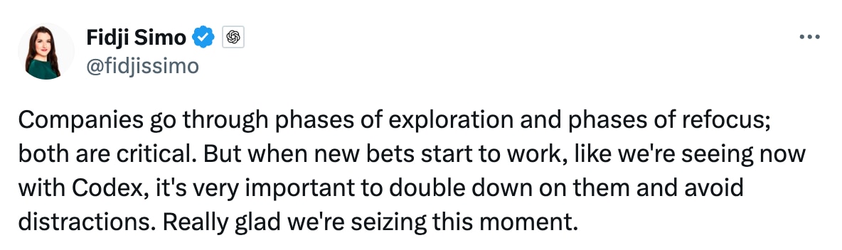 "But when new bets start to work, like we're seeing now with Codex, it's very important to double down on them and avoid distractions. Really glad we're seizing this moment,” she added.