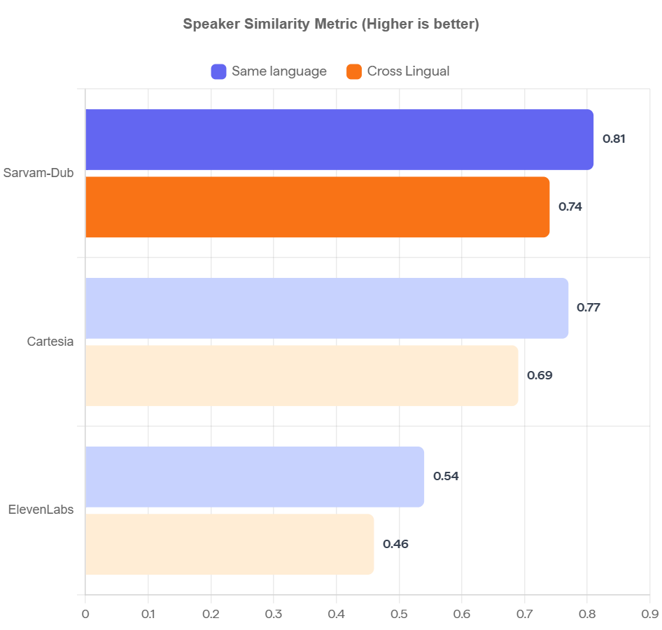 To benchmark performance, the company said it evaluated more than 700 audio samples across 64 speakers in 10 Indian languages and English, using speaker-similarity scores derived from ECAPA-TDNN embeddings. Sarvam said its model achieved state-of-the-art results, particularly in cross-lingual settings where voice preservation is hardest.