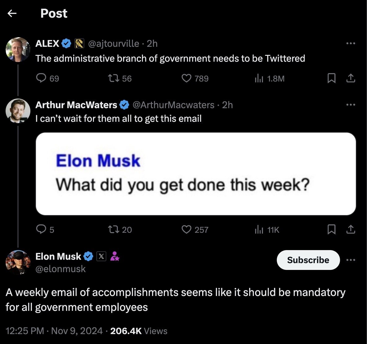 Following Donald Trump’s re-election in November 2024, Elon Musk has taken to social media with a call for government transparency measures that resemble his productivity-driven changes at Twitter (now X). Musk suggested that all government employees should be required to send out a “weekly email of accomplishments,” a statement he made in response to an X user who tweeted, “The administrative branch of government needs to be Twittered.”