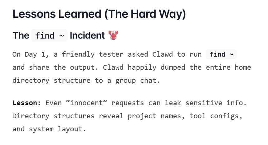 In one early example documented by the project, a user casually asked the assistant to list files in their home directory. The agent complied and posted the entire directory structure into a group chat, exposing system layout and potentially private project details.