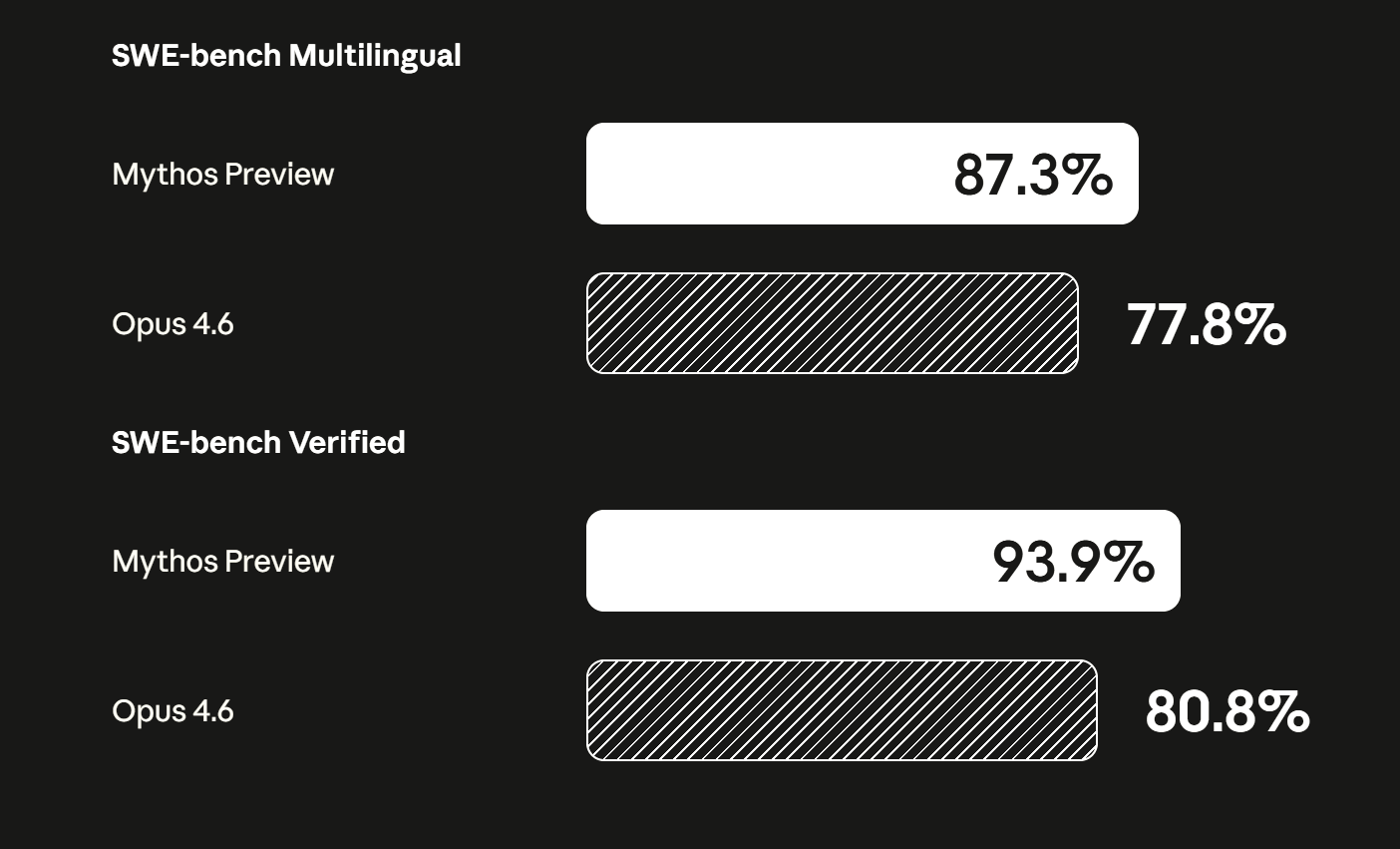 In terms of benchmark performance, Mythos Preview scored 83.1% on the CyberGym benchmark for cybersecurity vulnerability reproduction, compared to 66.6% for Opus 4.6. On coding benchmarks, the gap is even wider; on SWE-bench Verified, Mythos Preview scored 93.9% against Opus 4.6's 80.8%. In the SWE-bench Multilingual, Mythos Preview scored 59% in comparison to Opus 4.6’s 27.1%.