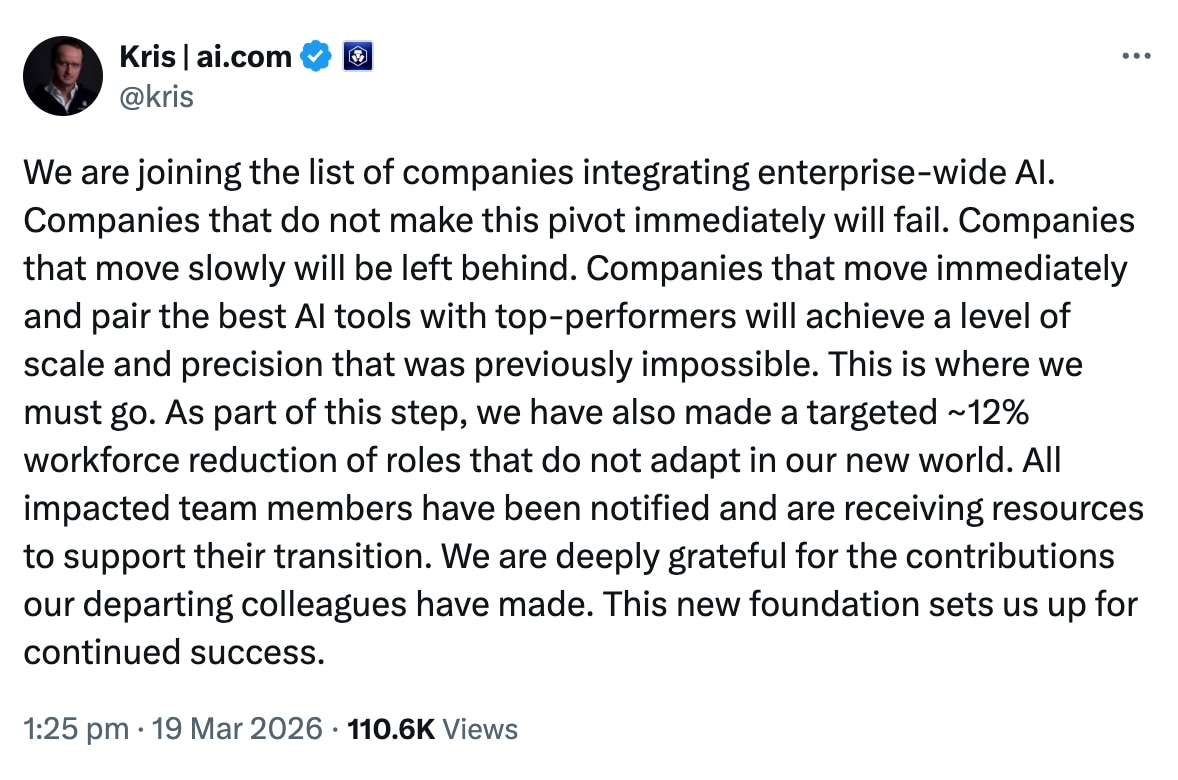 Crypto.com’s job reductions reflect a broader corporate shift, with greater AI adoption becoming the driver of workforce downsizing.