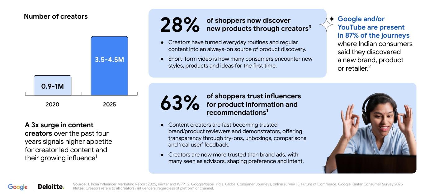 This transformation is already visible in consumer behaviour. Nearly 28% of shoppers now discover new products through creators, while 63% trust influencers for product recommendations, signalling a move away from traditional advertising to peer-led discovery.