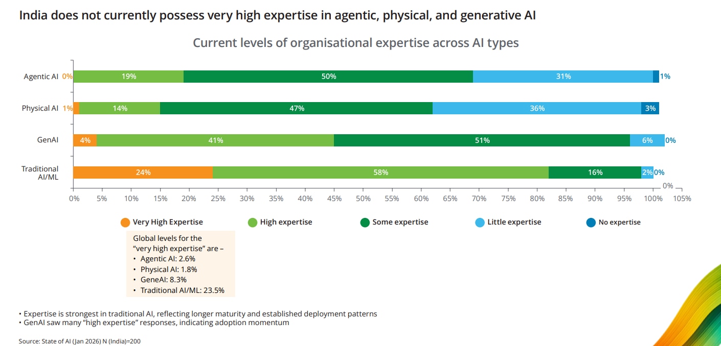 In generative AI, where India shows the strongest momentum on adoption, only 4% of Indian respondents claim very high expertise, against a global average of 8.3%. For agentic AI, the figure is zero, versus a global average of 2.6%.