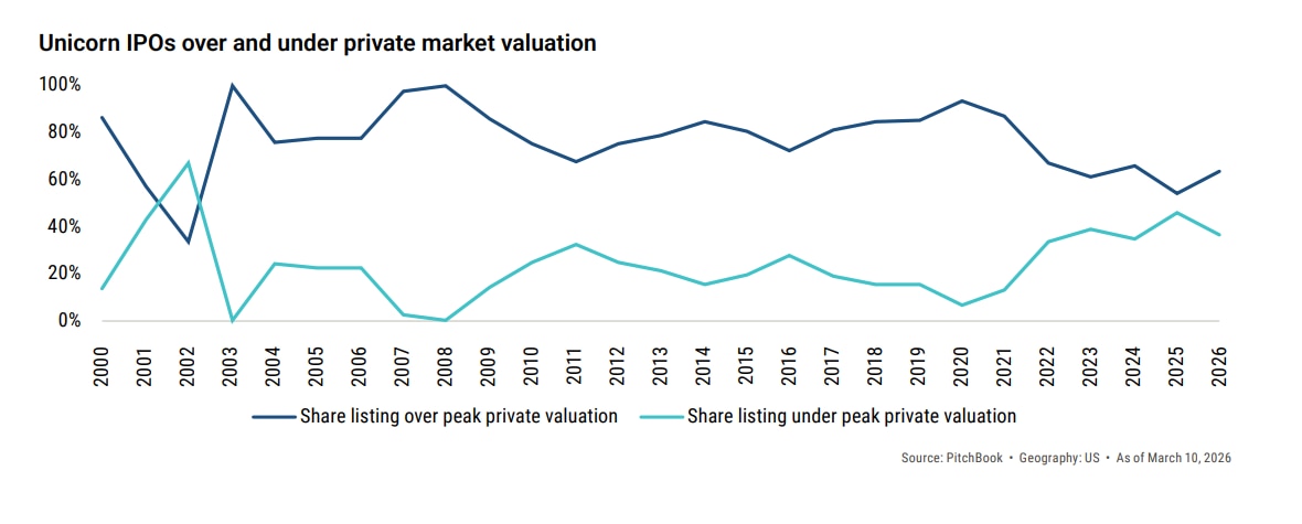 Recent performance hasn’t helped. In 2025, 17 unicorns went public, but 14 did so at valuations below their private peaks, and many have traded lower since listing.