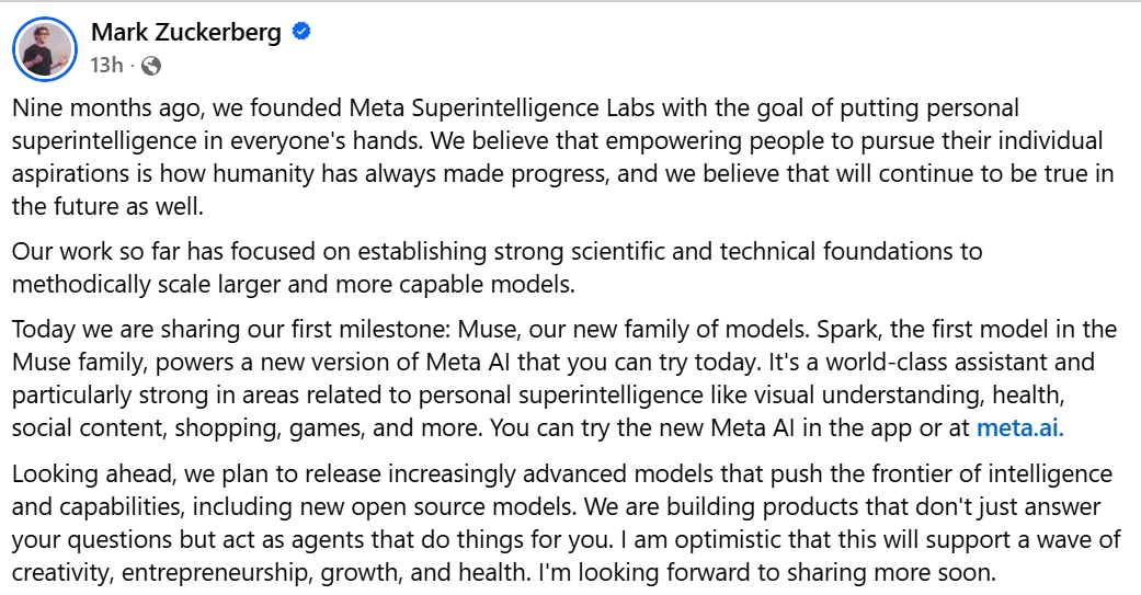 Muse Spark is the first “inaugural model” launched under Meta’s Superintelligence Labs, which was formed by CEO Mark Zuckerberg in July 2025. This new model is said to offer “personal intelligence” for everyday use, designed to manage tasks such as visual understanding, health, shopping, and social content.
