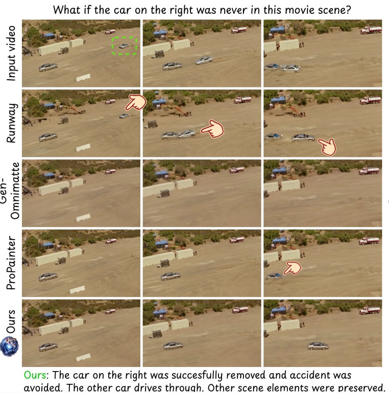Think of a crash sequence. A car slams into a truck, explodes, debris flies everywhere, the kind of scene that costs millions to shoot. Now imagine being able to erase the truck entirely and have the AI seamlessly generate a version where the car just drives away, as if the crash never happened.