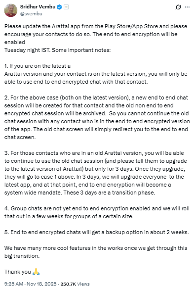 With the encryption update going live Tuesday night, Vembu’s message to users remains simple: update the app, remind your contacts, and prepare for a more secure Arattai experience.